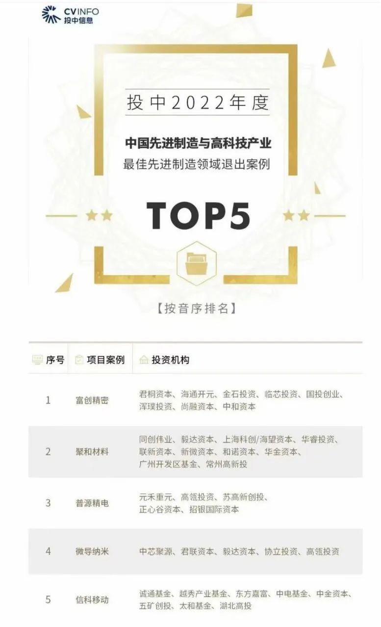 威尼斯9499登录入口金控集团投资企业富创细密荣获投中2022年度最佳先进制造领域退出案例TOP5